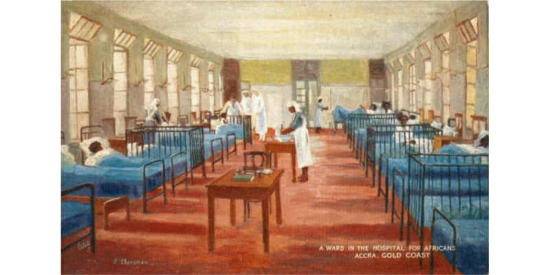 In our digital archive we hold the Boardman postcard collection, which consists of 1061 nursing postcards. This collection was bequeathed to the Royal College of Nursing Archives by Elizabeth Boardman, a postcard collector specialising in nursing and hospital related postcards. Ranging from portraits of nurses, First World War cartoons and in this case an overseas hospital you can find some interesting images. Some of the cards are unused, but many have been written on and are postmarked and have stamps attached.This postcard entitled ‘Ward in Hospital for Africans, Accra’ illustrates a ward in a hospital, in Accra, Gold Coast (modern Ghana). Although the reverse of the card has not been written on it does bear the Royal Warrant of Raphael Tuck and Sons and the original copyright held by the Gold Coast Government. The hospital depicted opened in 1923 and the postcard is dated around the same time. At it’s opening the hospital accommodated over 200 patients. It is suspected to depict Korle Bu Hospital, which today has maintained its premier status as a health facility in Ghana.