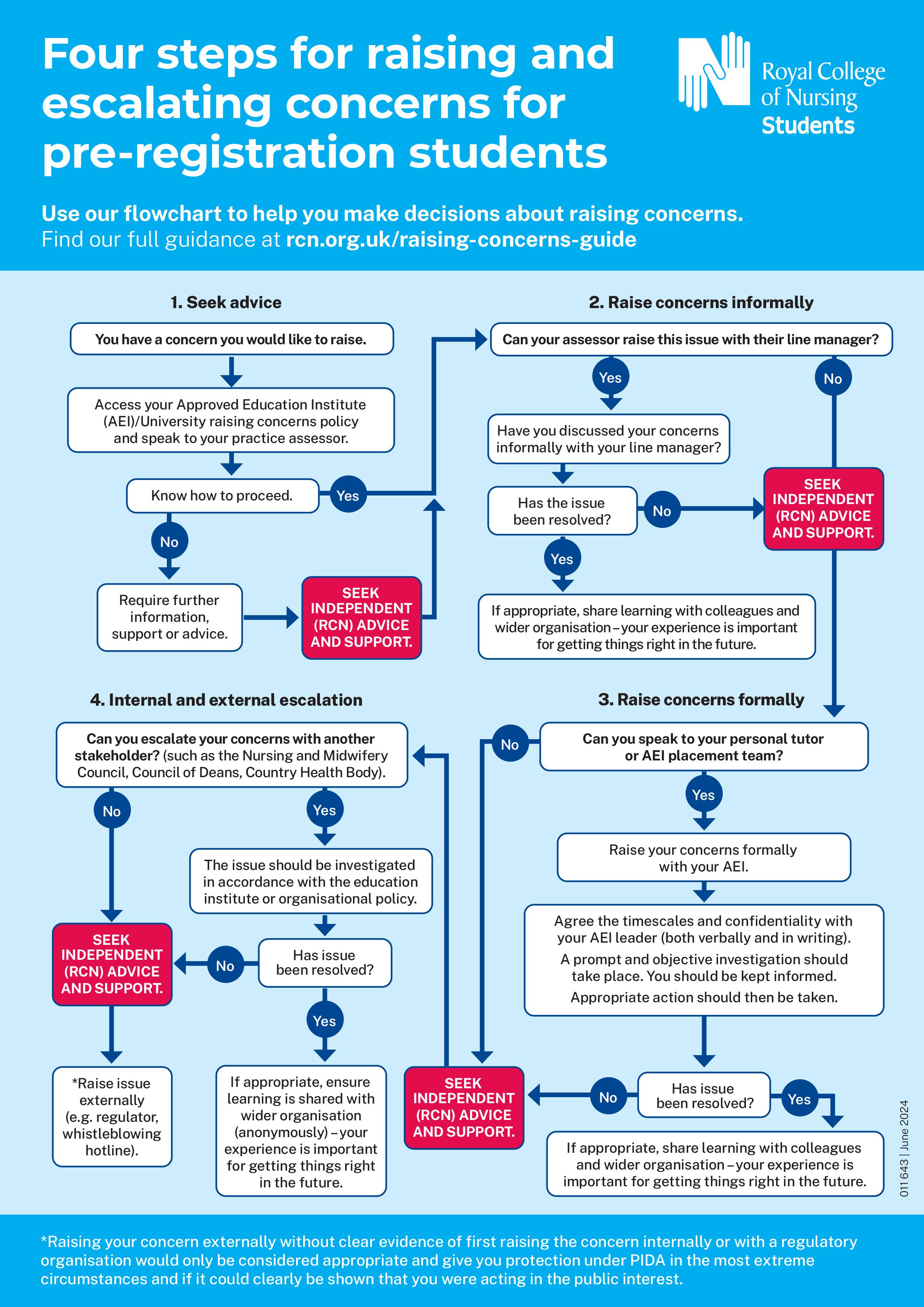 If you’re considering escalating your concern to a third party/disclosing it publicly, it is very important you seek advice from the RCN first. Read about what to do if it is unresolved and contact us for further advice.