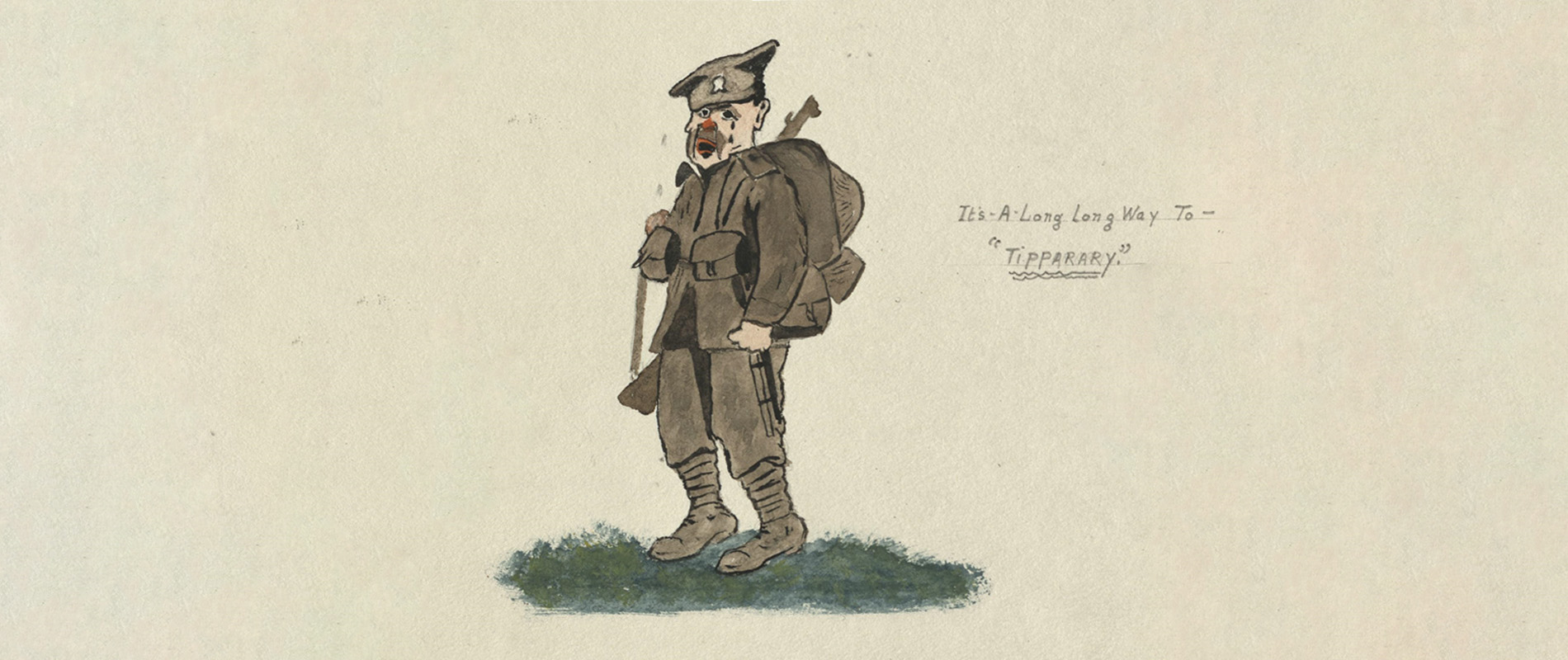 In this image a crying soldier is captioned with 'It's a Long, Long Way to Tipperary.', which refers to the title of a song popularised in the First World War. Reputedly a favourite amongst the British soldiers, it was sang as they marched through France. As the illustration indicates, 'Tipperary' has a sorrowful tone. The focus on longing for home sets it apart from previous war songs, which were normally about bravado and victory.